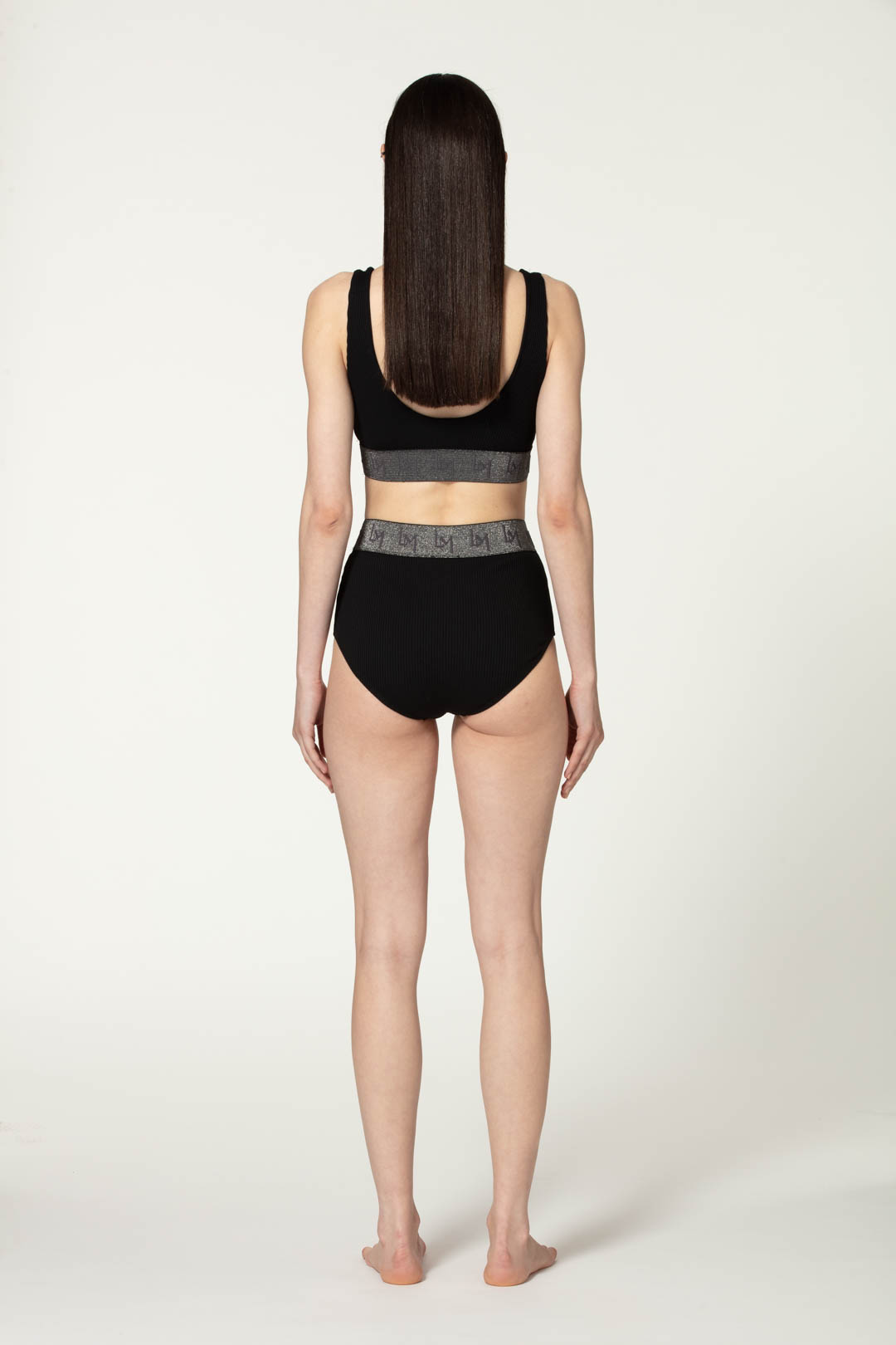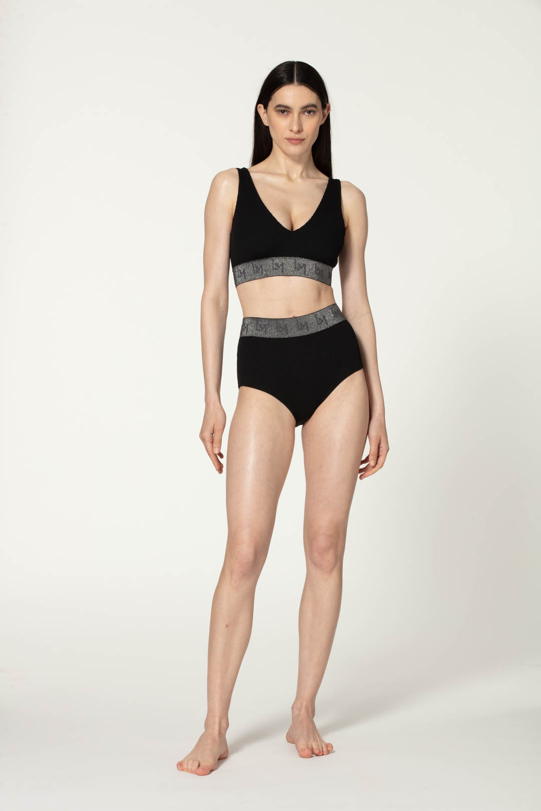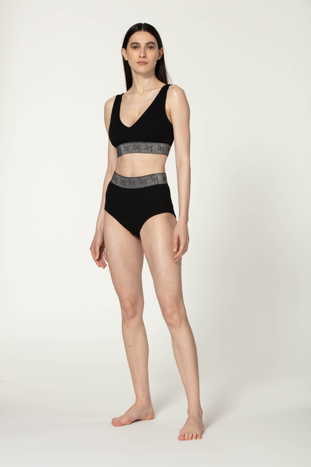 Top in tessuto a maglia a costine con fascia elastica logata in lurex e tasca interna per coppe Made in Italy